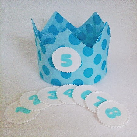 Die Zahlenbuttons von 1 - 8 sind im Lieferumfang enthalten (die Zahl “9” kann durch eine auf den Kopf gedrehte “6” dargestellt werden) und werden in Ihrer Wunschfarbe aus Filz geschnitten und auf weißen Stickfilz geklebt. Diese Buttons werden durch einen Druckknopf an der Krone befestigt und können ganz einfach ausgetauscht werden. Sie können außerdem jede beliebige zweistellige Zahl auf einem zusätzlichen Button dazu - oder nachbestellen.